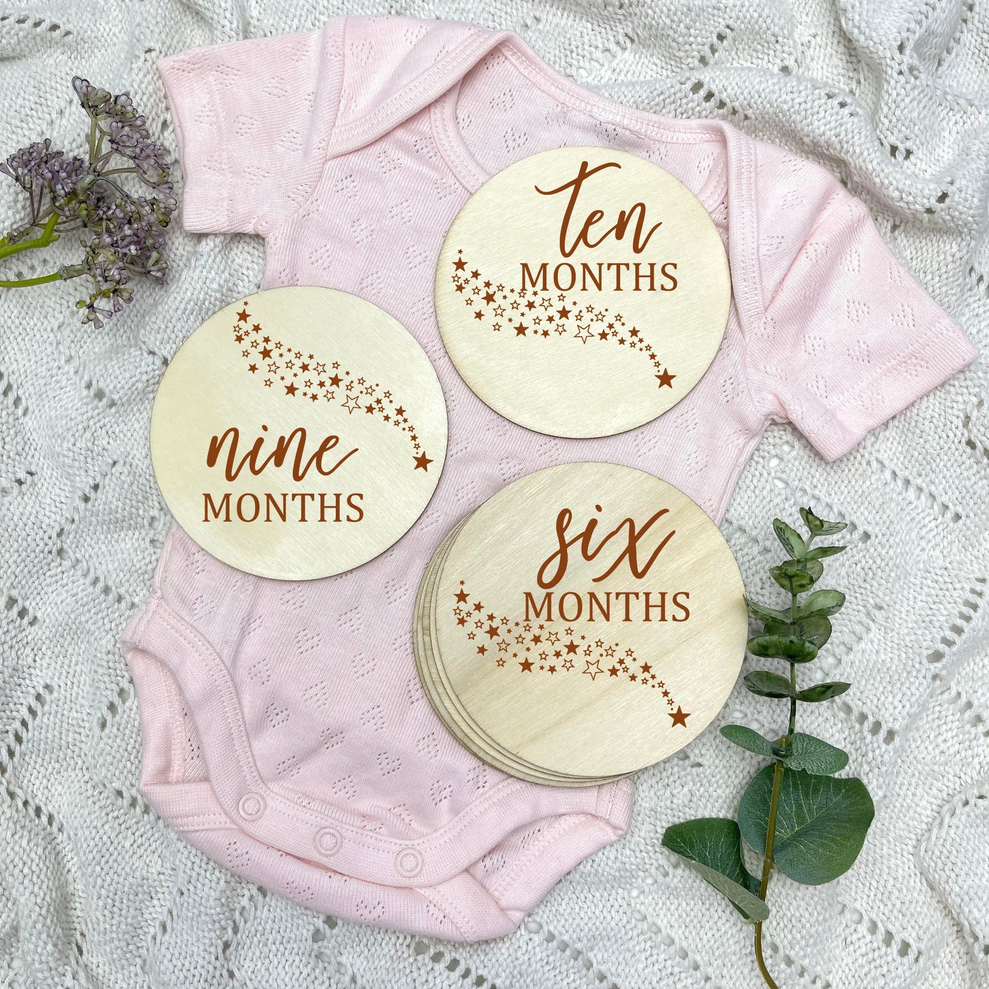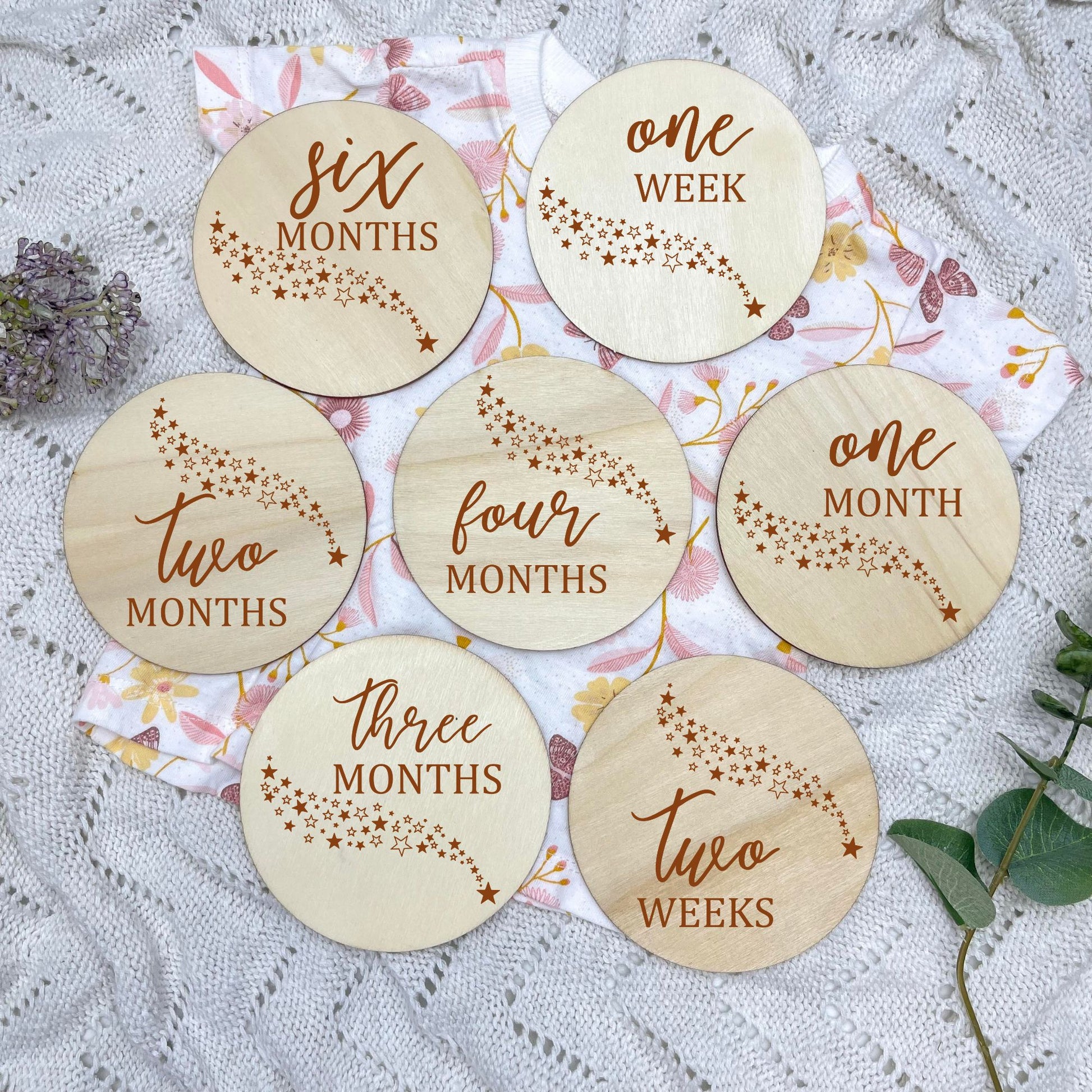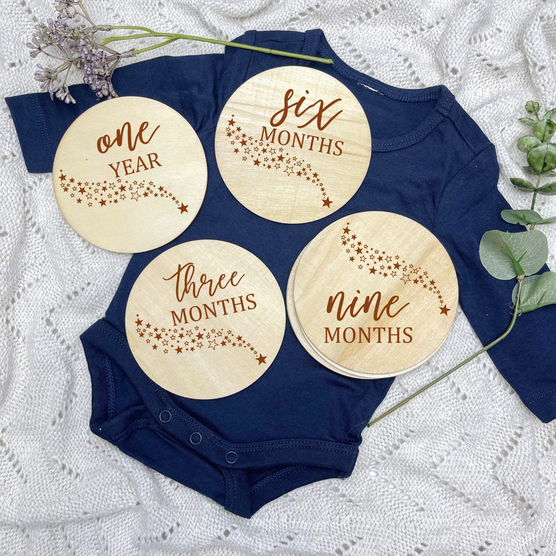 You can enhance the experience with our perfectly matching designs, you can pair the milestone cards with our separate Hello World, I'm here, name discs, or pregnancy announcement discs, which are 15cm in size. These are sold SEPARATELY within the listing.